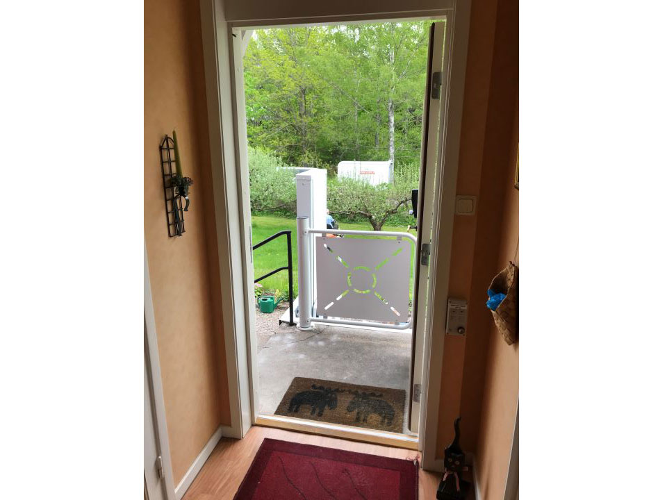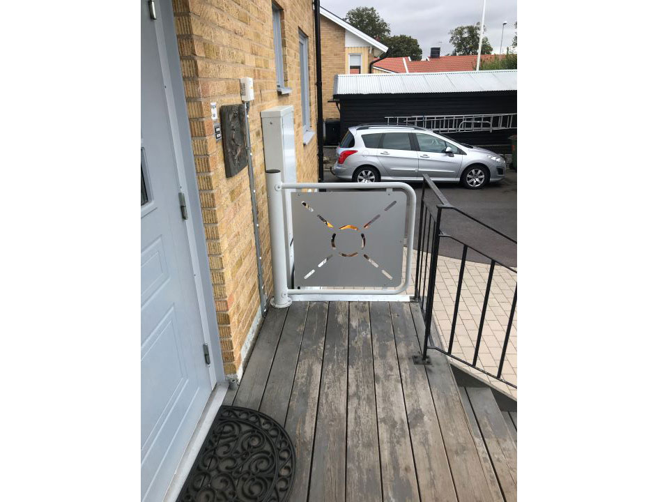 För att förhindra risk för klämskador när plattformen sänks, är plattformens undersida täckt med en brytarplatta, som stoppar hissen omedelbart vid kontakt med något föremål. Vid övre plan ingår en grind med automatiska dörröppnare.